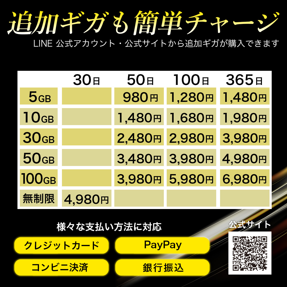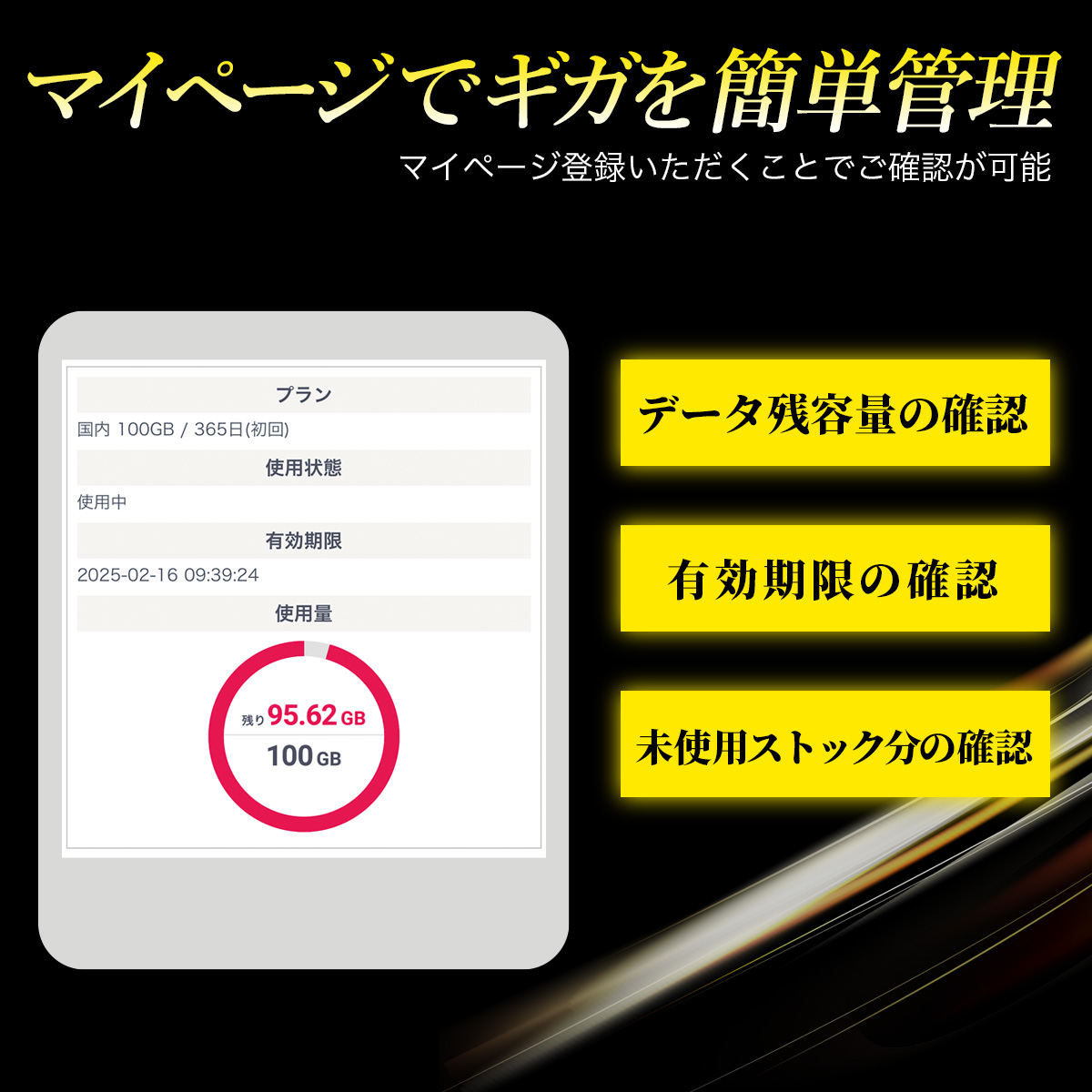 ギガ数をお選びいただけます【100G/365日間・100G/50日間・10G/365日間・10G/50日間・ギガ無制限/30日間】